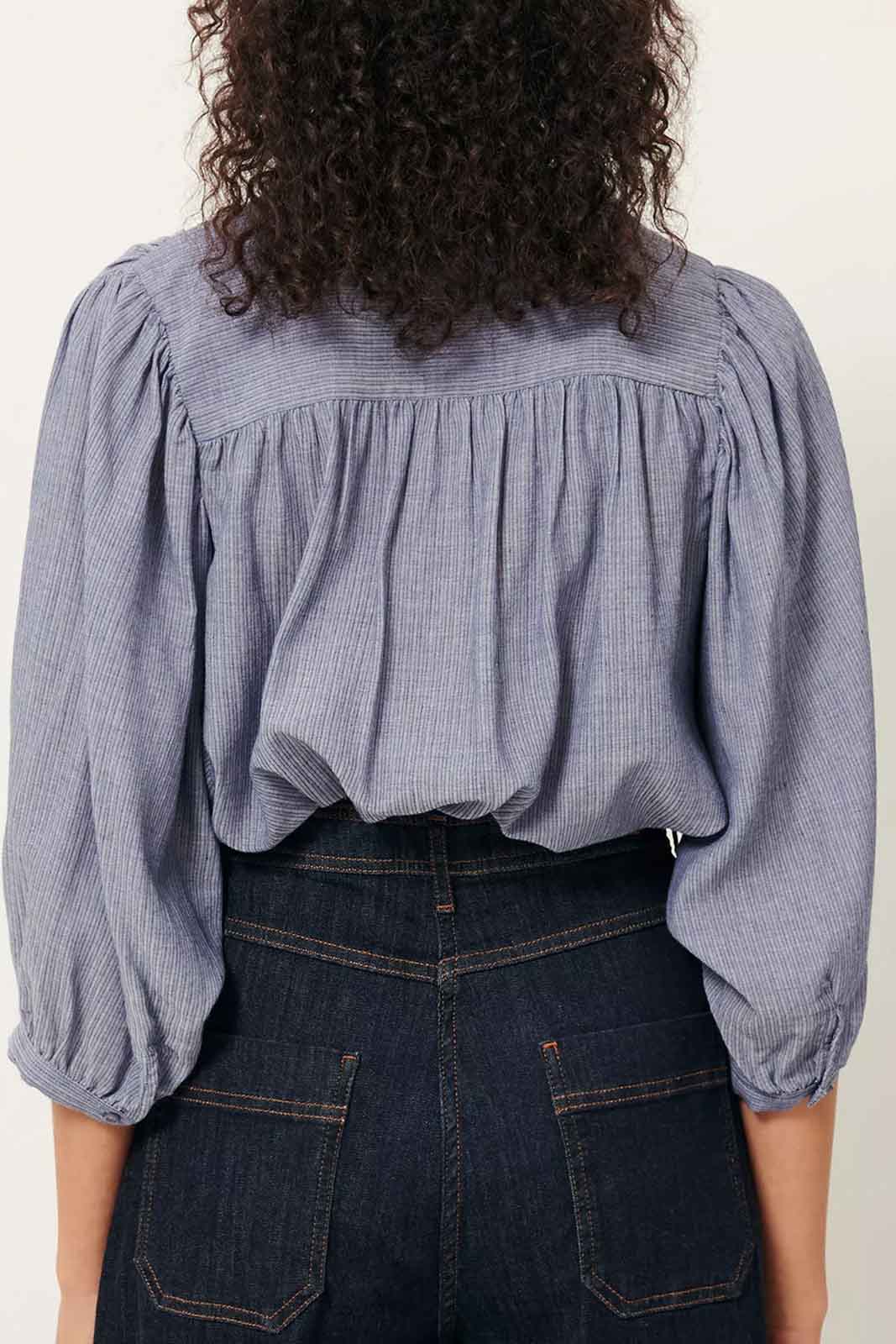Die Bluse A View in der Farbe Chambray Blue von Sessun besteht aus 55% Viskose und 45% Baumwolle.