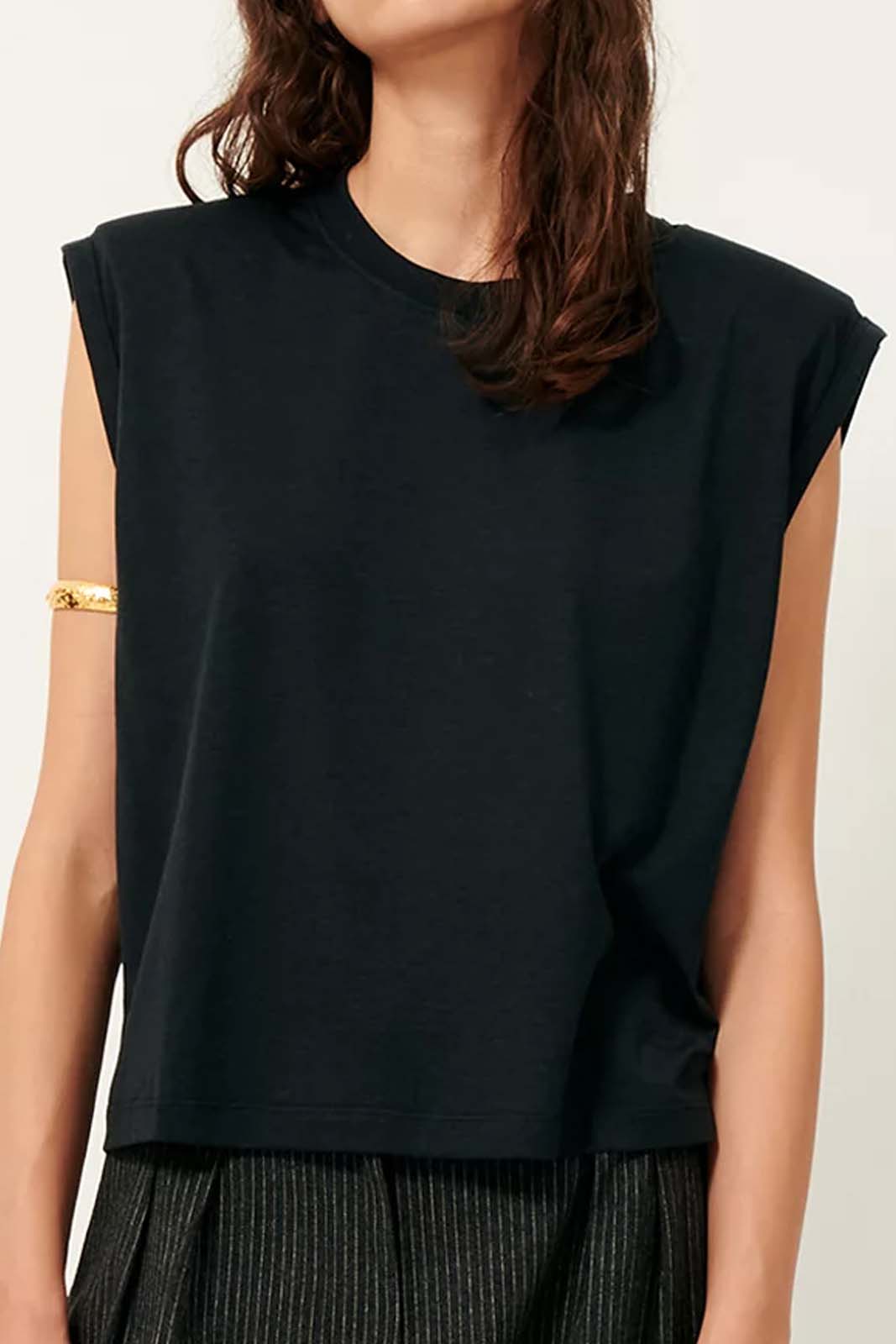 Das ärmelloses T-shirt Dee mit Schulterpolstern in der Farbe Moonless von Sessun besteht aus 67% Lyocell und 33% Baumwolle.