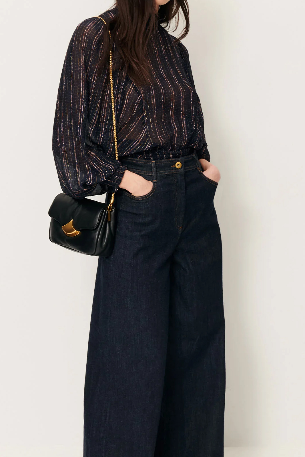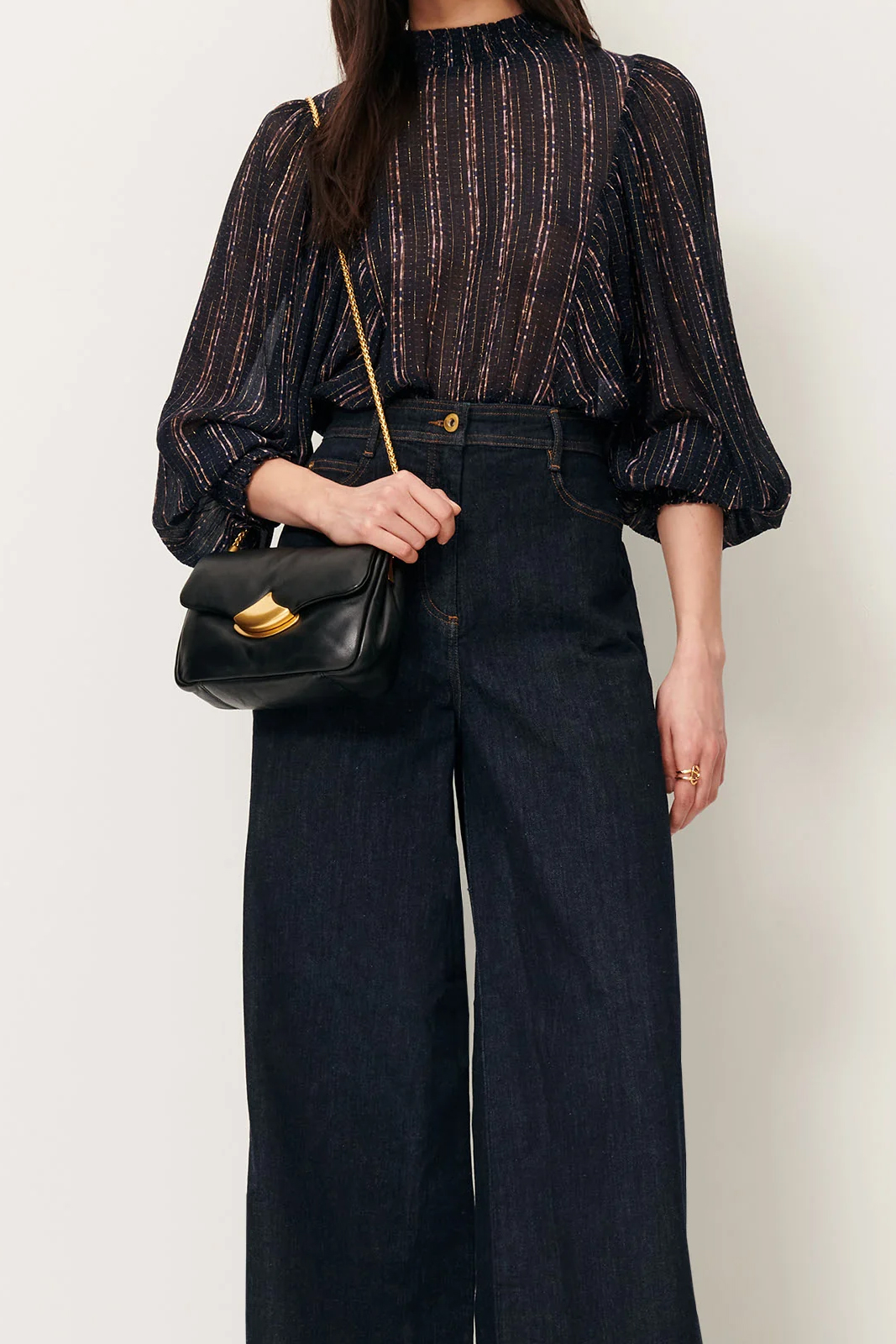 Die Bluse Duchess in der Farbe Plumilux von Sessun besteht aus 82% Viskose, 16% Seide und 2% Lurex.