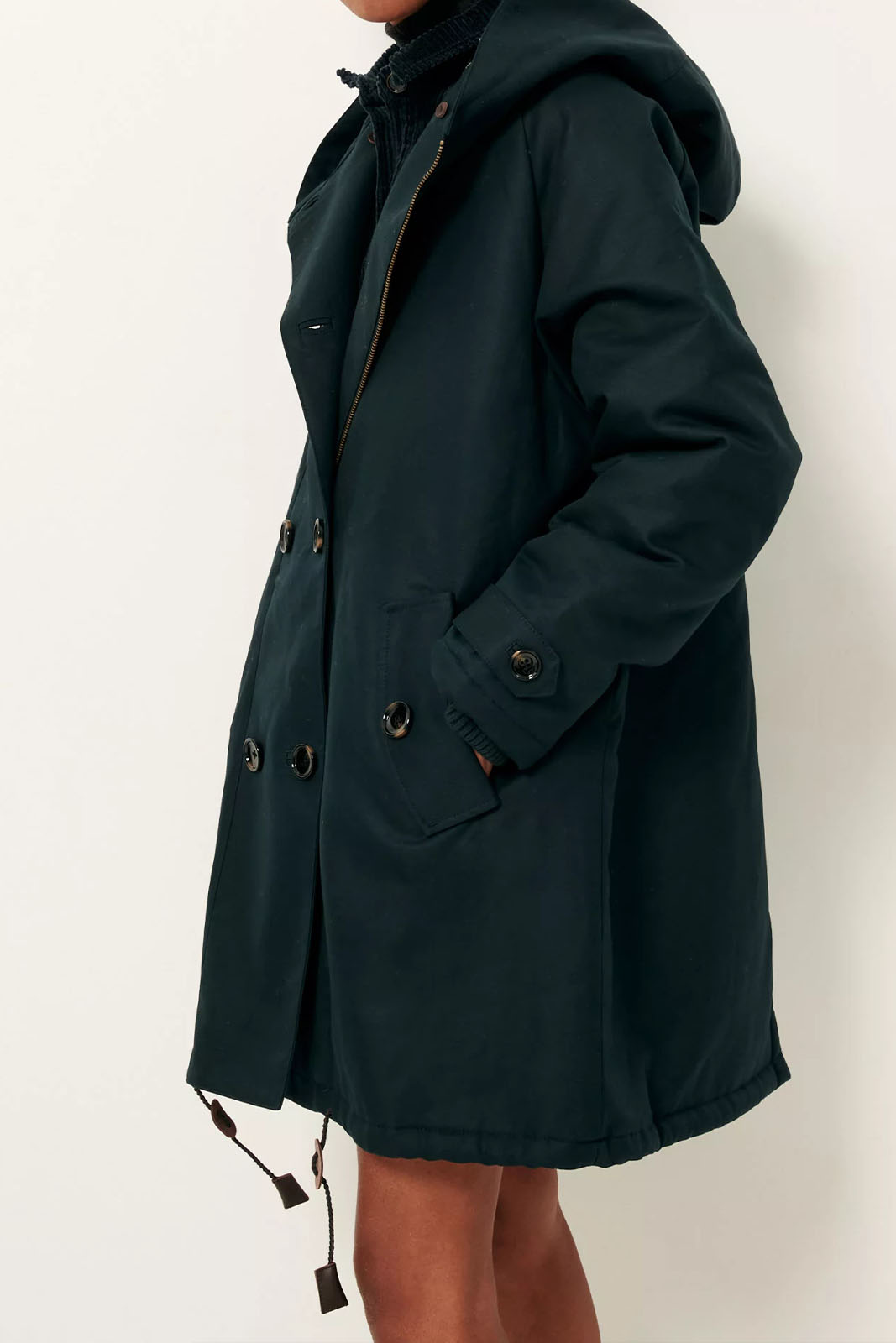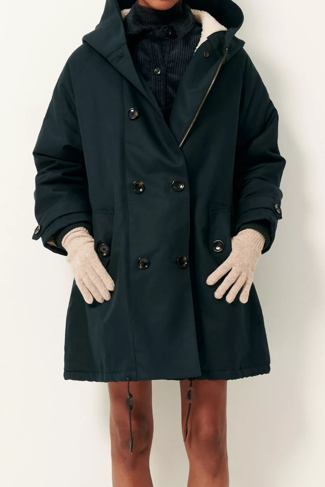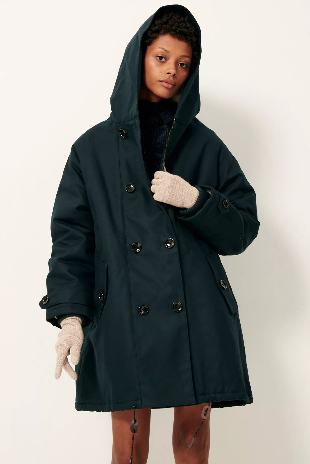 Passform: weit geschnitten, mit Kapuze aus wasserabweisendem Baumwoll-Gabardine, vorn doppelt geknöpft, lange Raglanärmel, hinten geschlitzt, Futter in Schafsfelloptik.