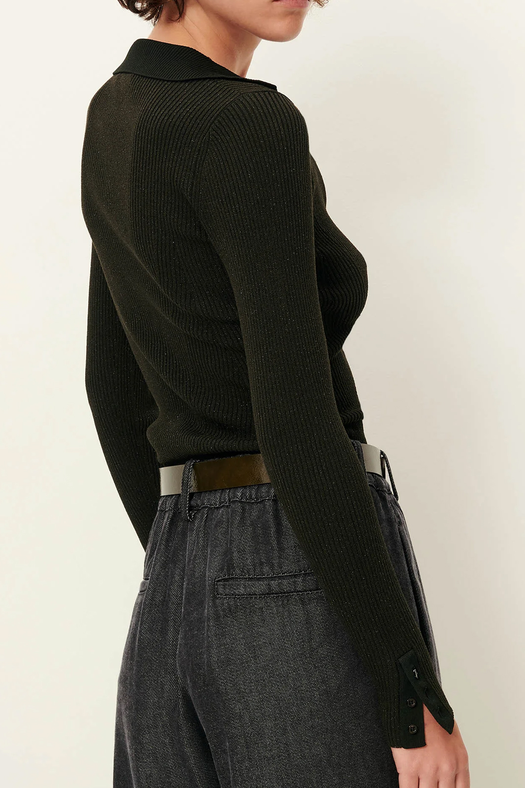 Das Strickpolo Lykke in der Farbe Moonlux von Sessun besteht aus 76%Viskose, 12%Polyamid, 6% Metallic und 6% Polyamid.