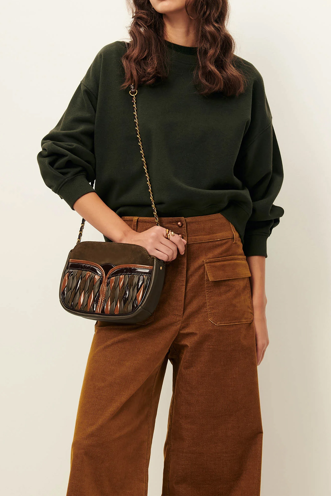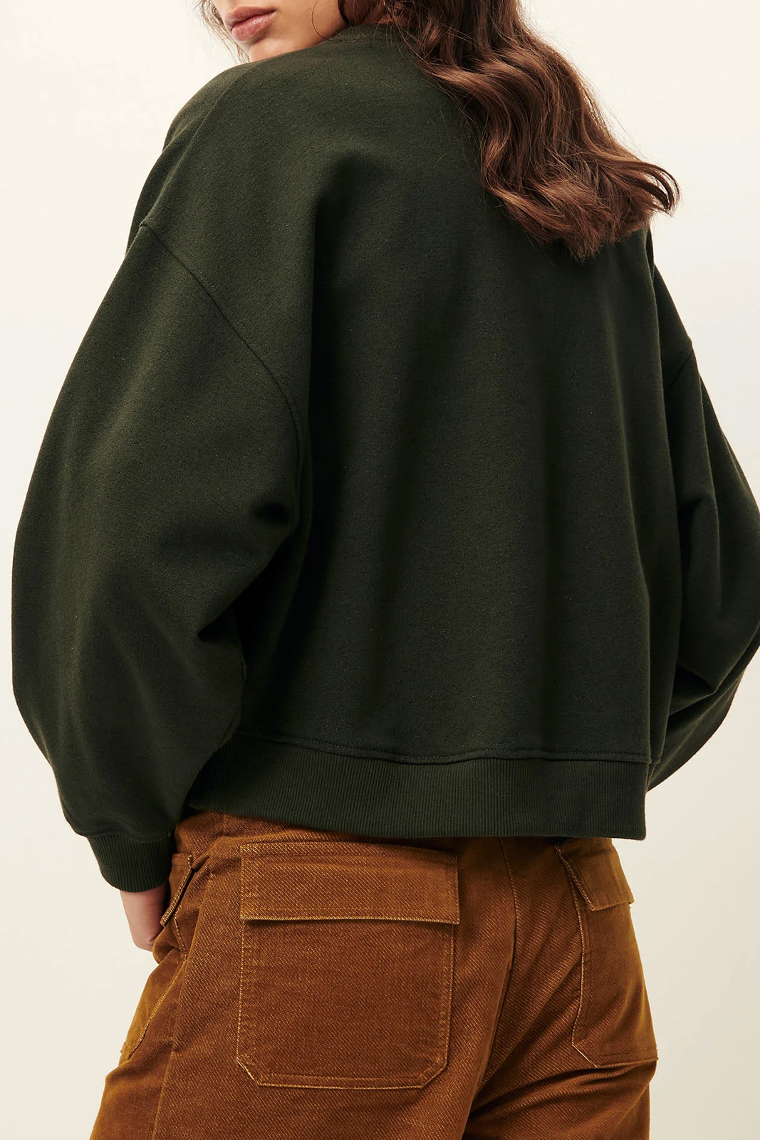 Das Sweatshirt Yuki in der Farbe Forestlux von Sessun besteht aus 83% Baumwolle, 9% Metallic, 8% Polyamid.