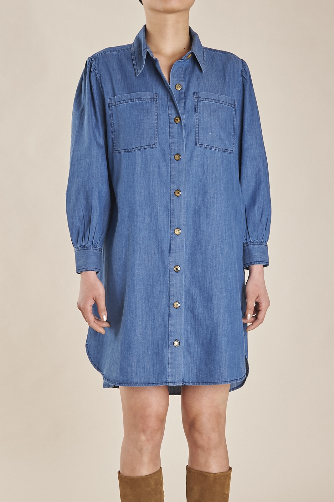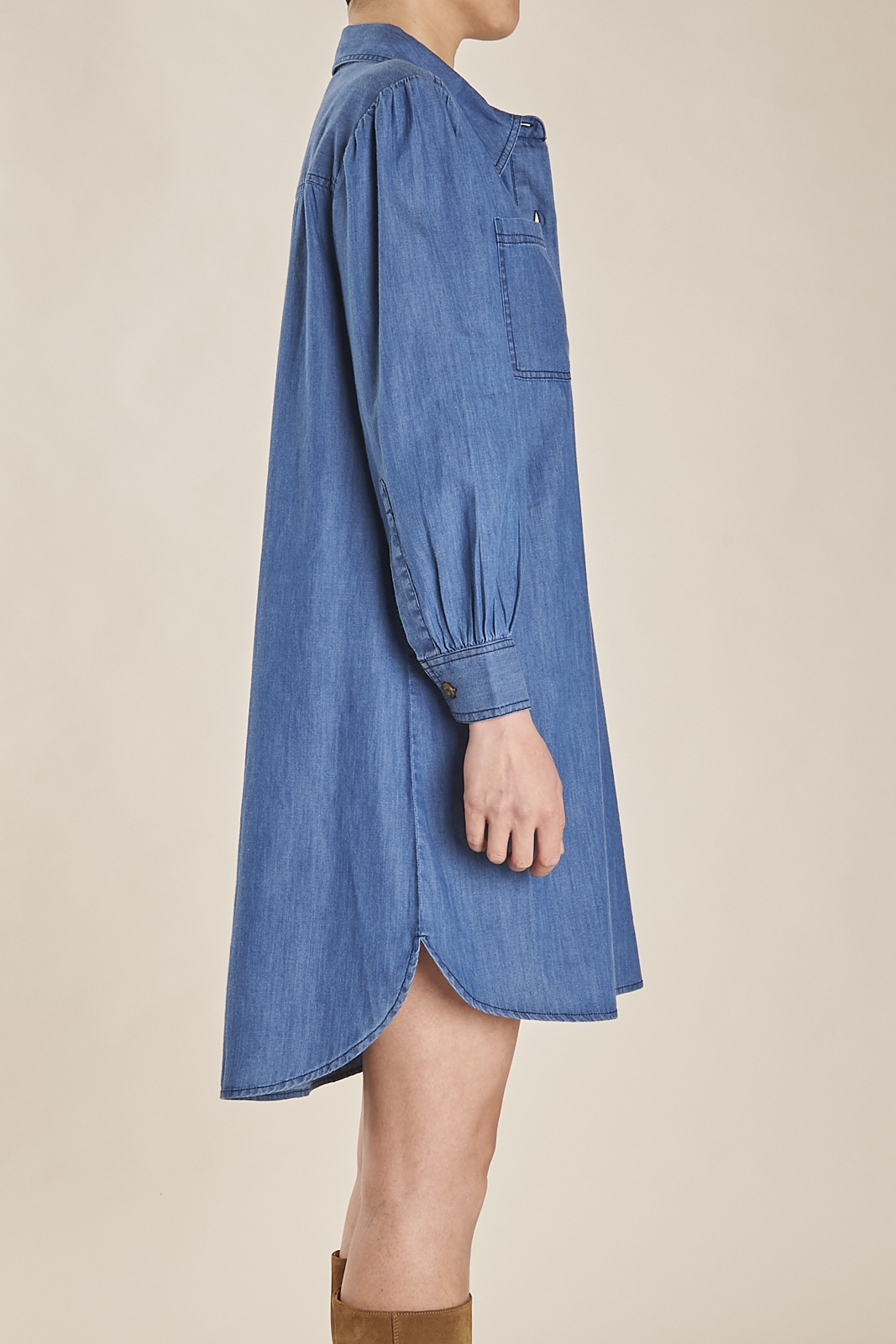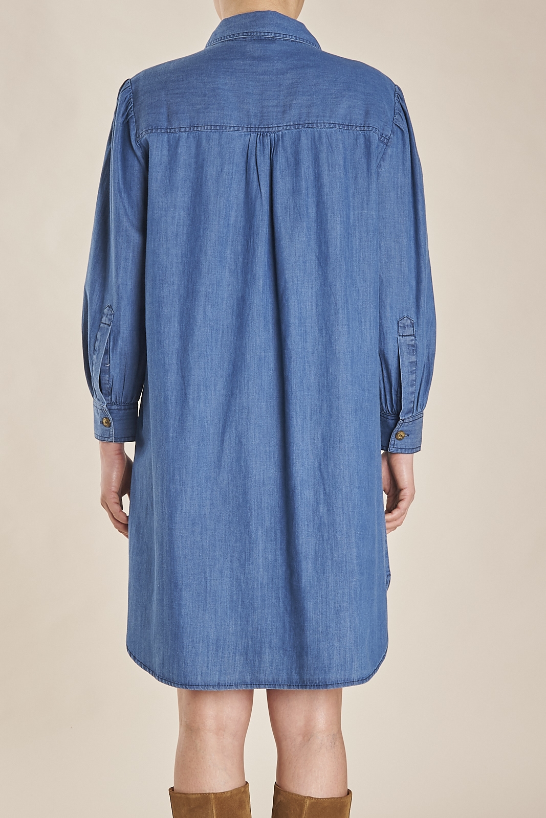 Das Kleid Salomé in der Farbe Chambray Denim von Petite Mendigote besteht aus 100% Baumwolle.