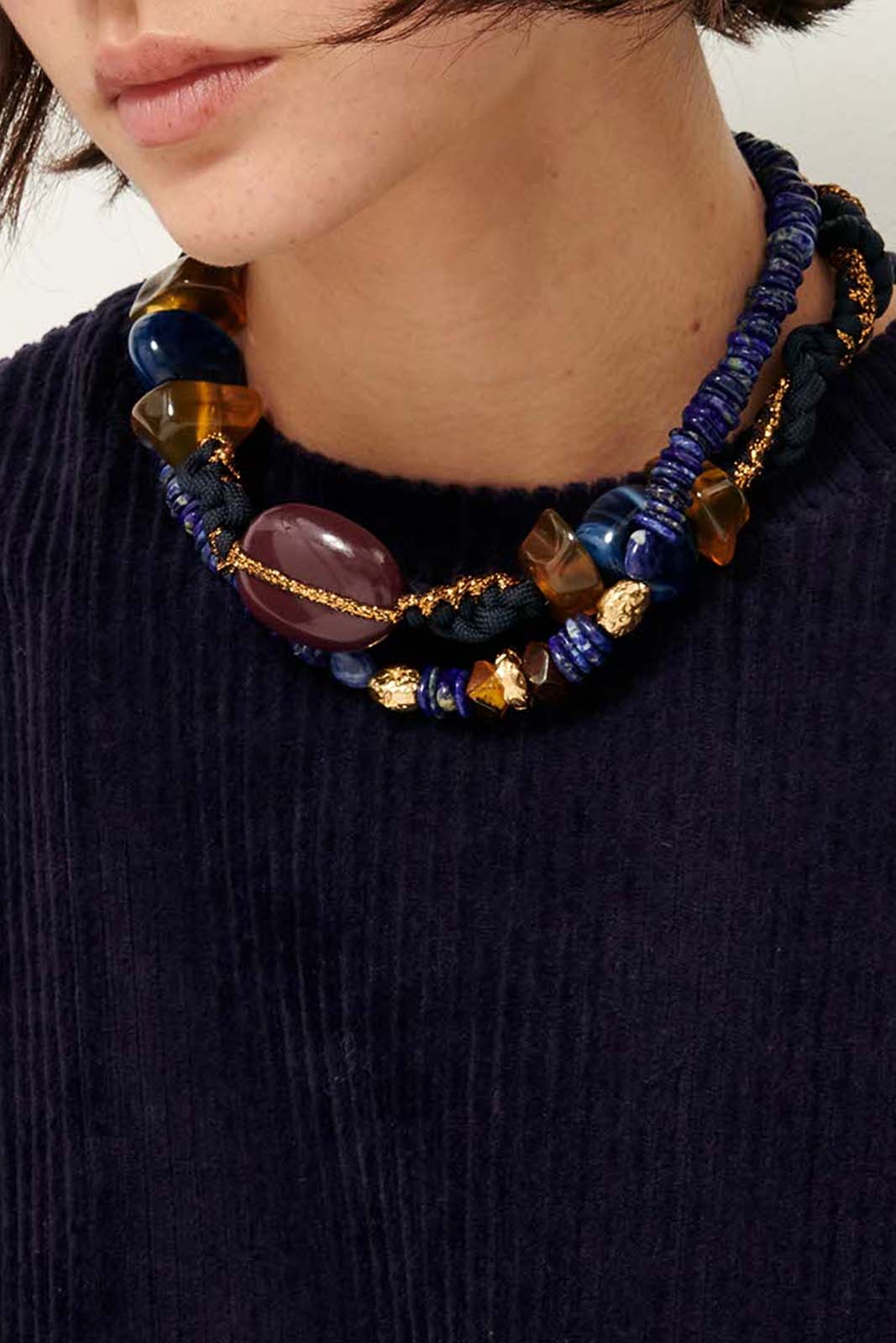 Die Kette Anneli in der Farbe Tiger Blue von Sessun besteht aus 10% vergoldete Messing, 50% Polyester, 30% Kunstharz und 10% Lurex.