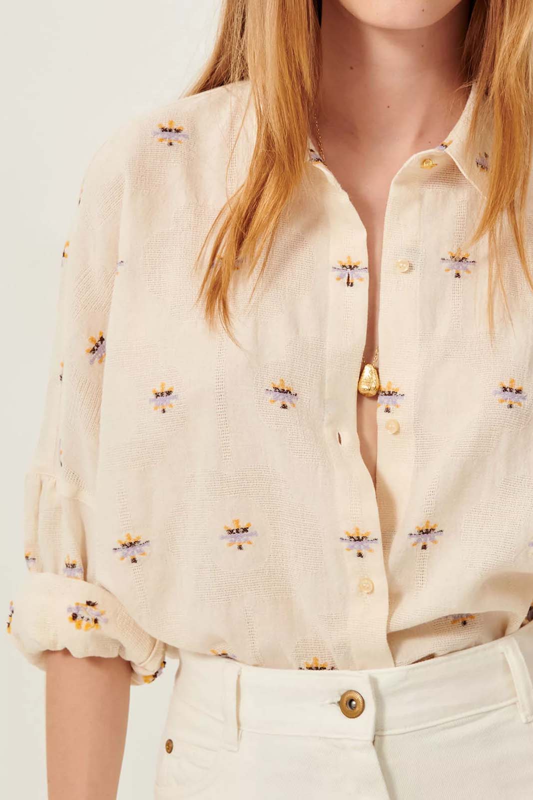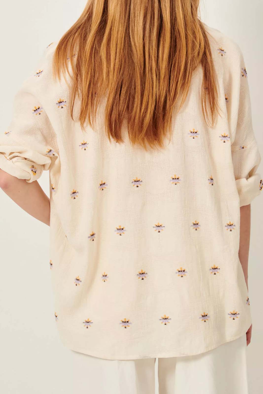 Die Bluse Botenzo in der Farbe Whibloom von Sessun besteht aus 98% Baumwolle, 1% Polyester und 1% andere Fasern.