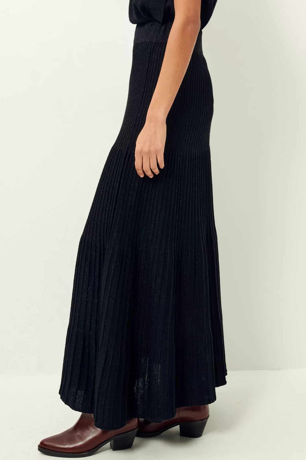Der Rock Cami Luz in der Farbe Blacknight von Sessun besteht aus 69% Viskose, 13% Wolle, 11%Polyamid und 7% Metallfasern.