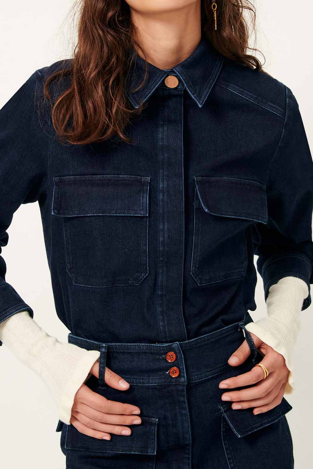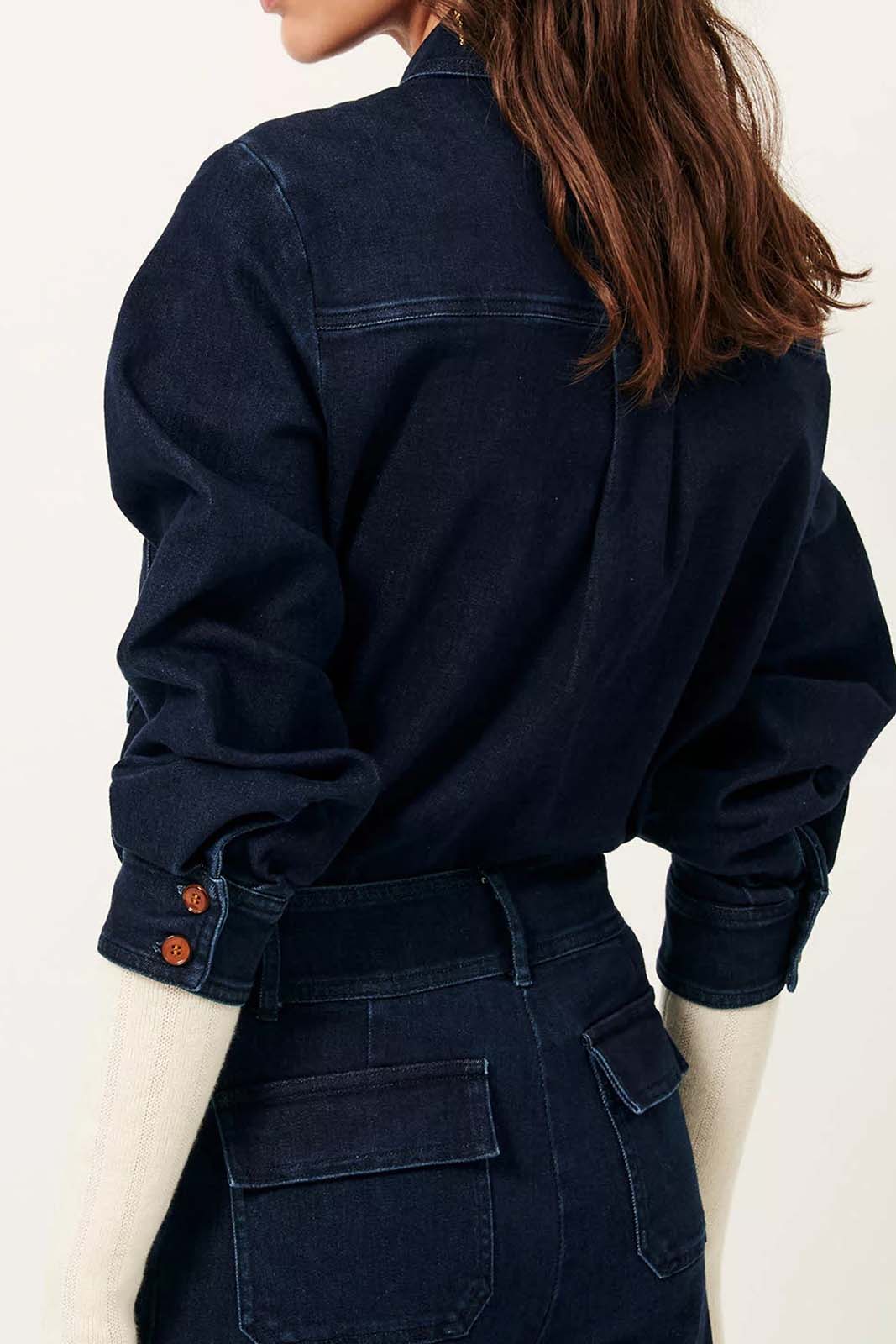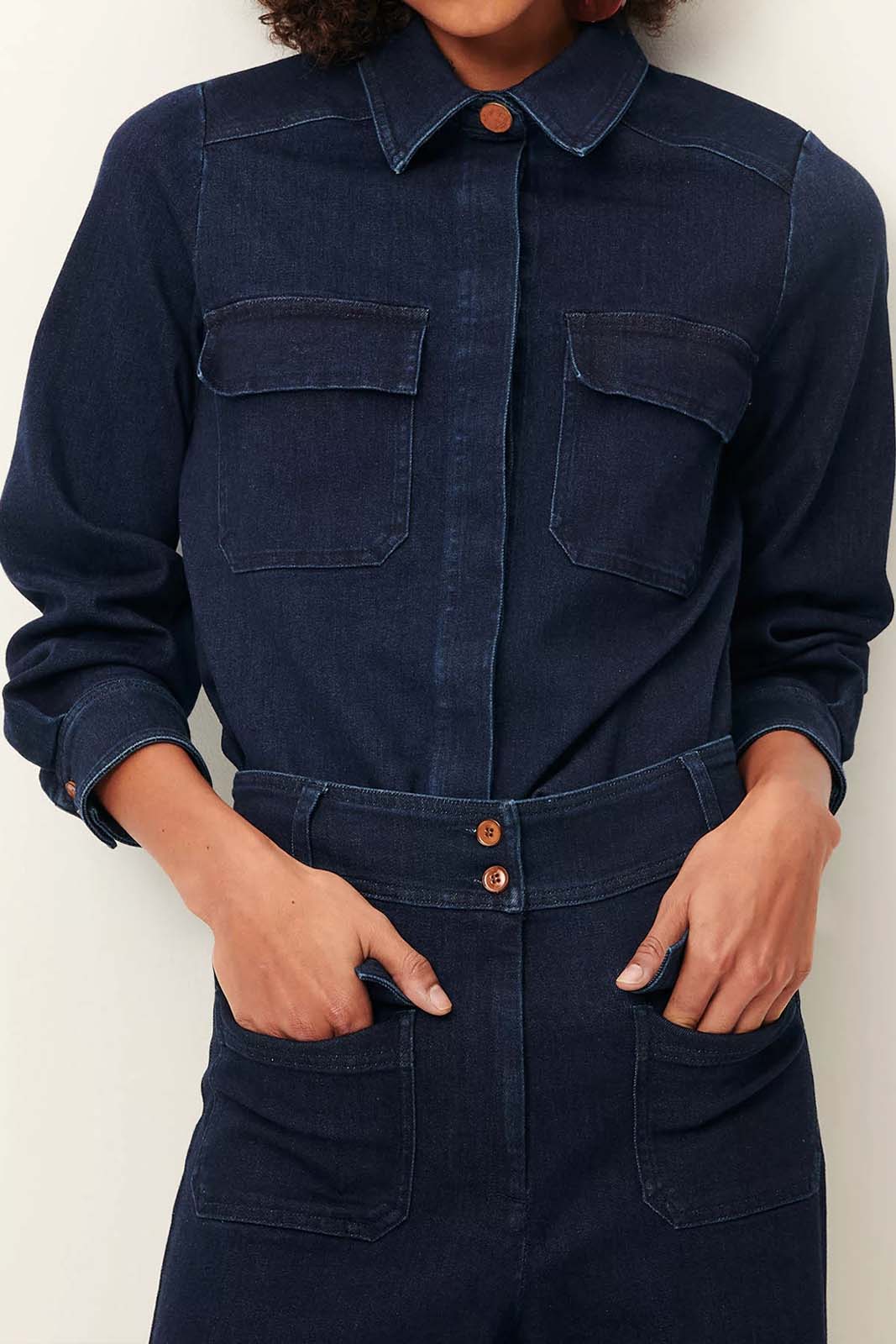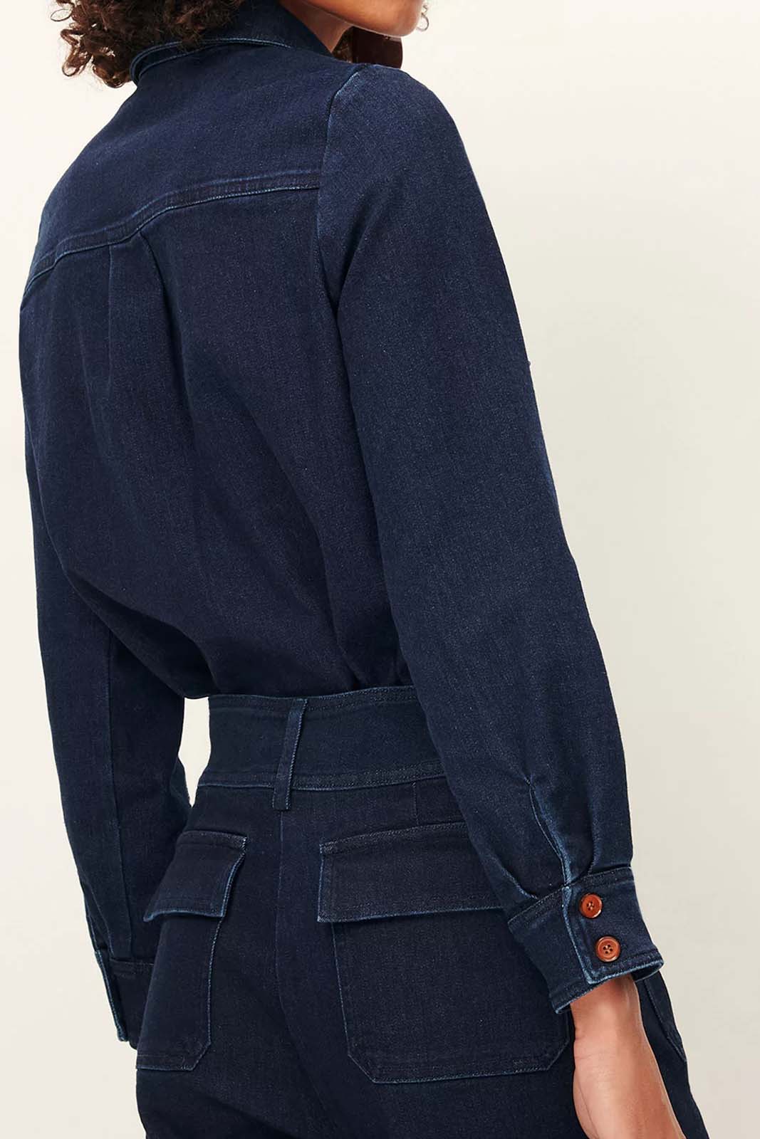 Der Stoff besteht aus gewaschenem Denim-Twill und Indigo-gefärbten Garnen.