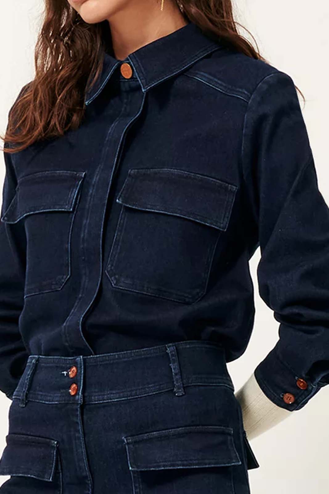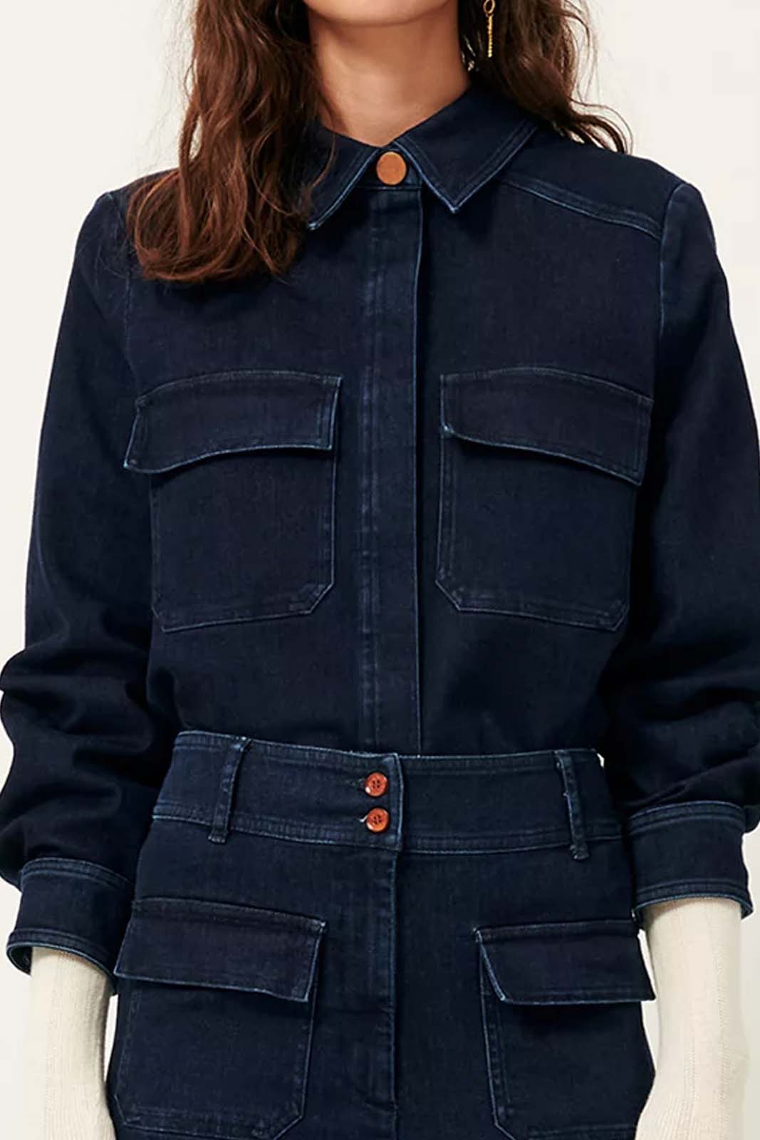 Das körperbetontes Hemd in der Farbe Denim Blue von Sessun besteht aus 79% Baumwolle, 20% recycled Polyester und 1% Elastan.