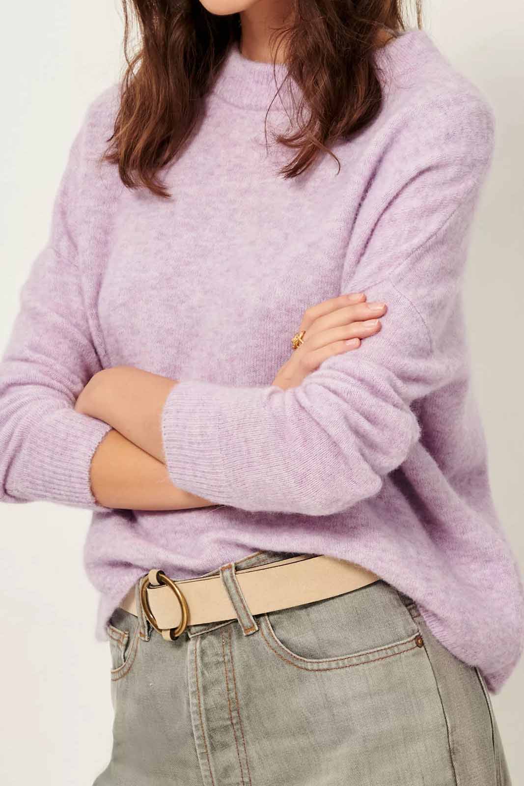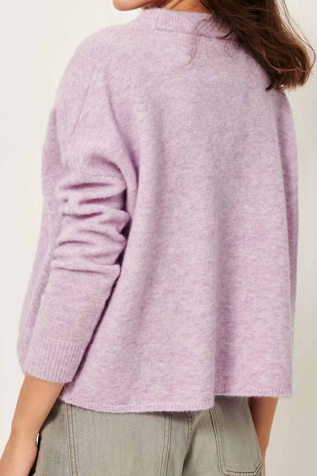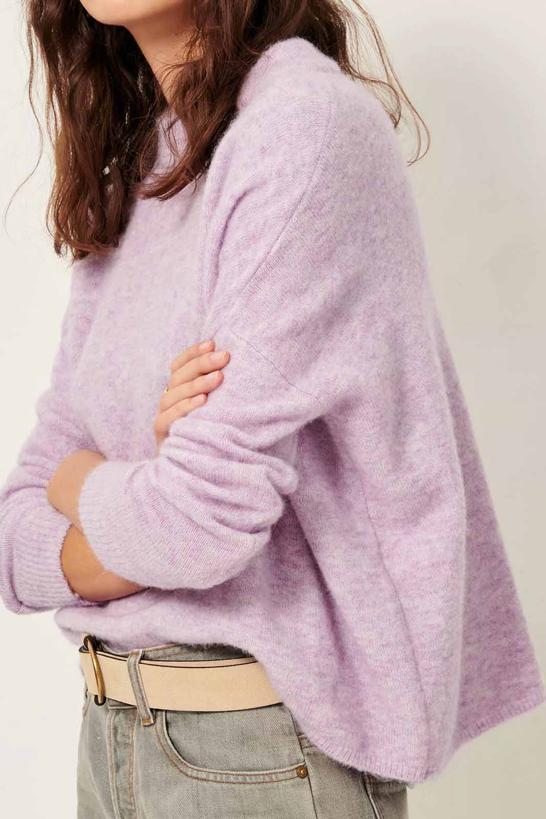 Der Pulli Kunlun in der Farbe Wild Lila von Sessun besteht aus 33% Merinowolle, 33% Alpaka, 30% Polyamid und 4% Elastan.