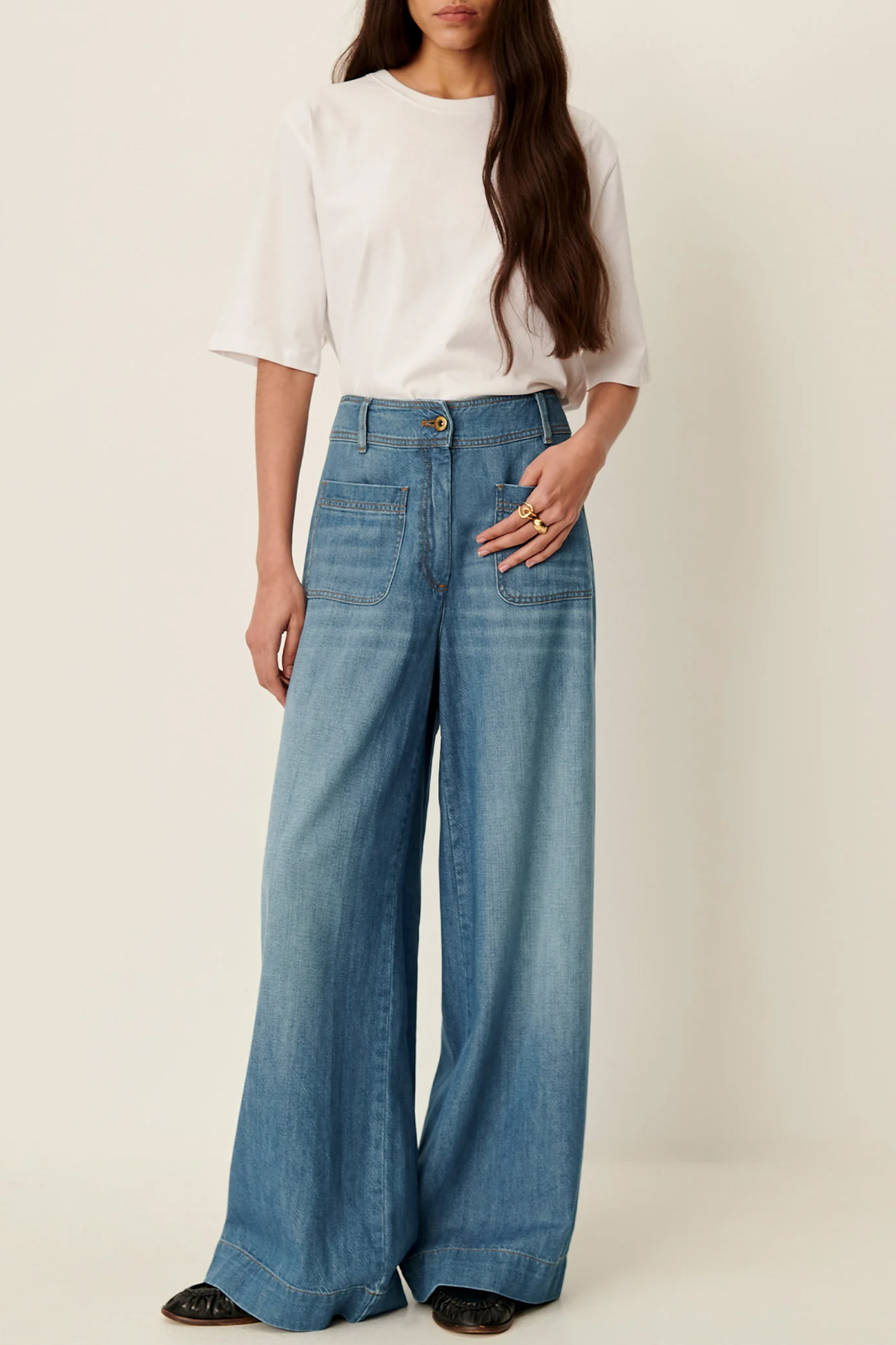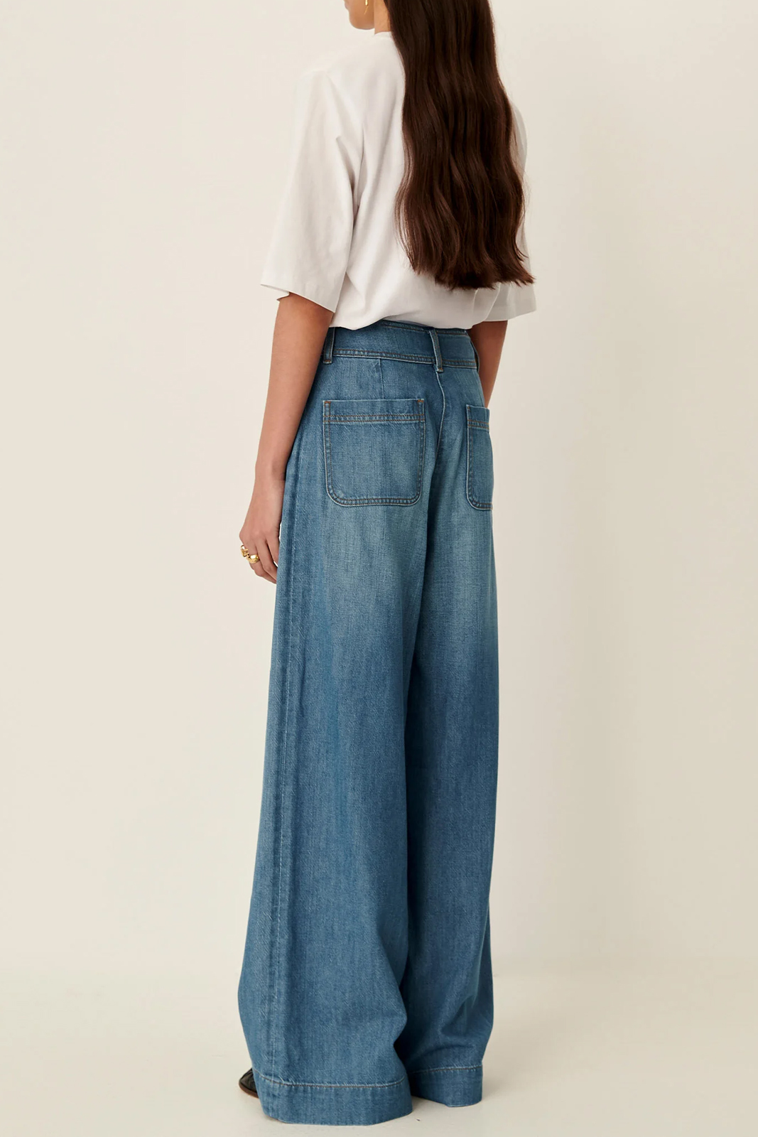 Die Hose Manhablue in der Farbe Bay Blue von Sessun besteht aus 100% Baumwolle