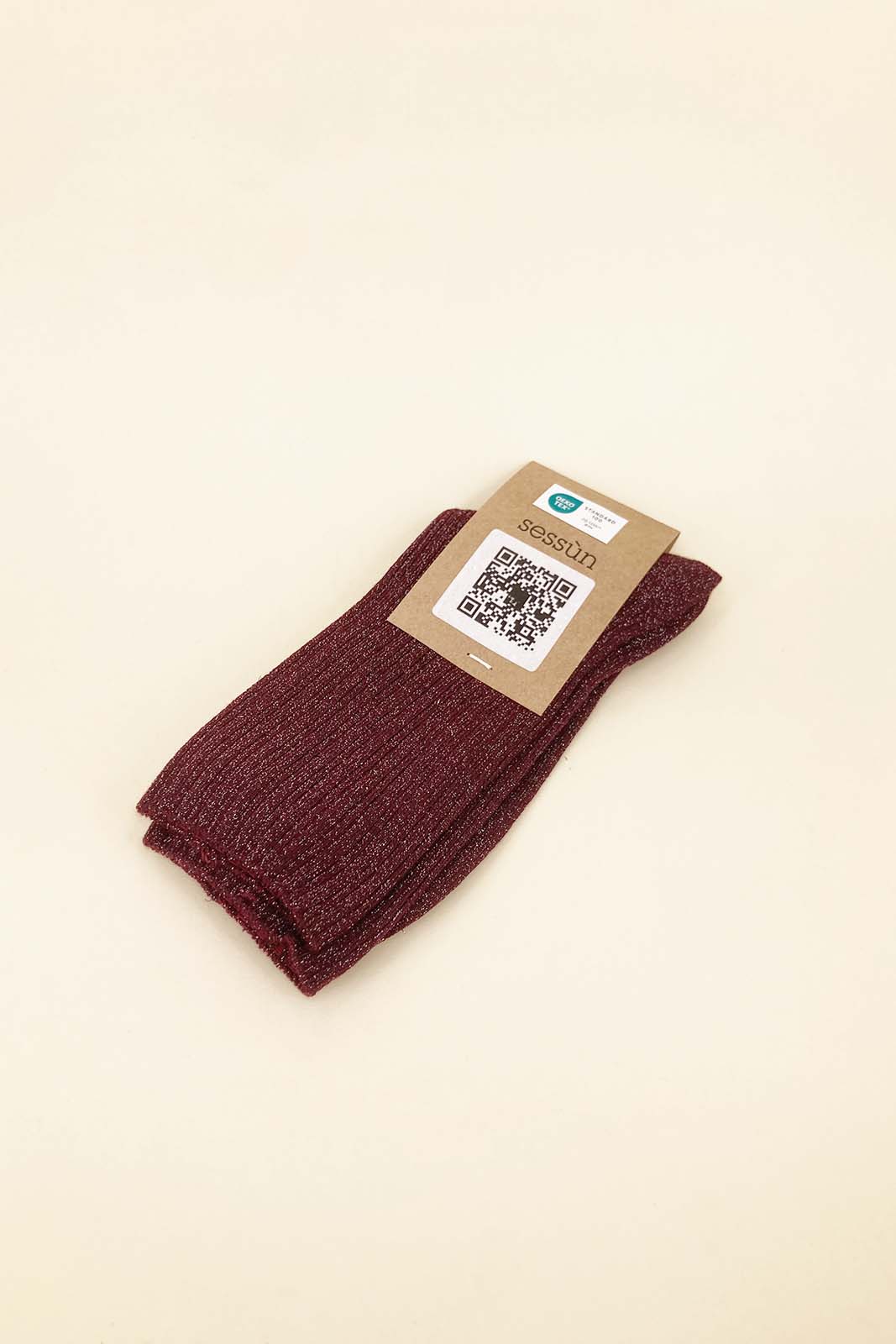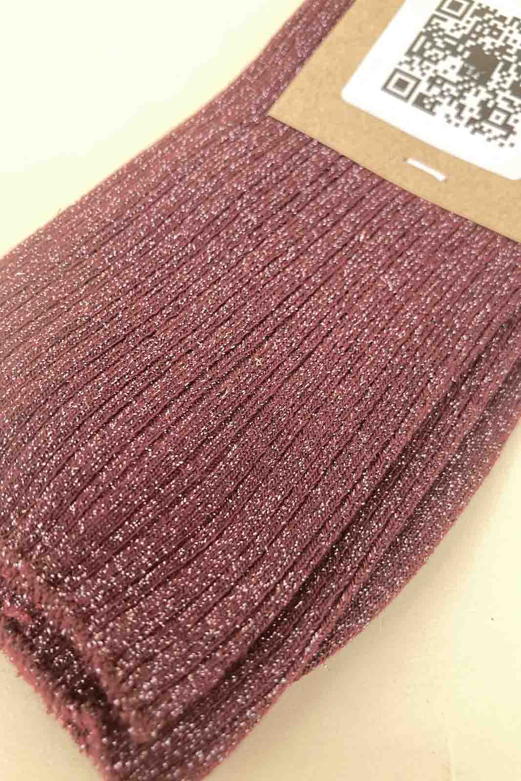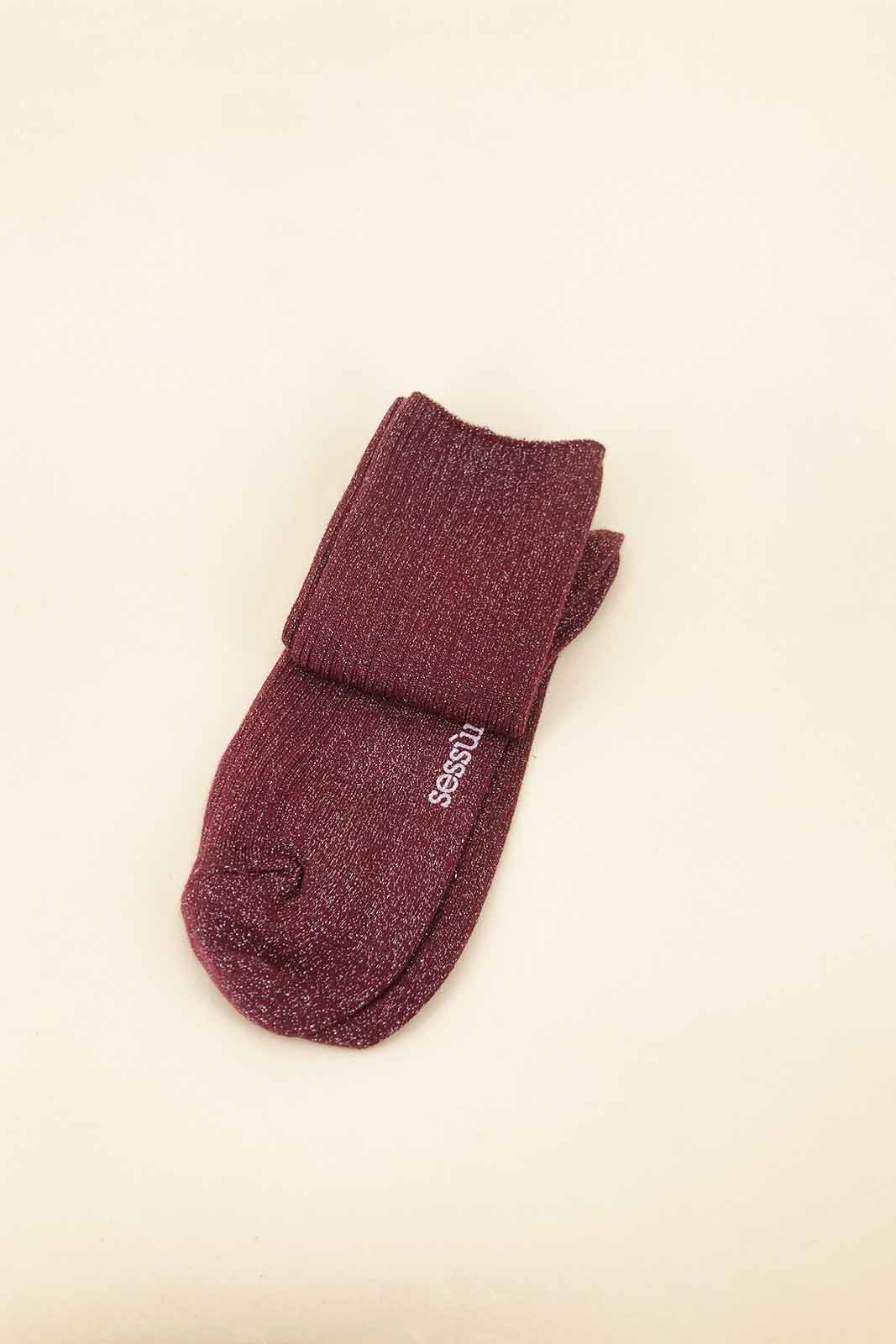 Die Rippstrick-Socken Sokini in der Farbe Plum von Sessun bestehen aus 75% Bauwolle und 25% metallische Fasern.