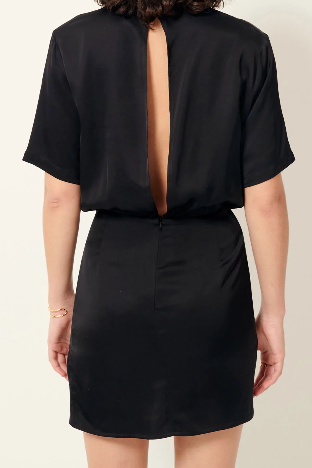 Das Kleid Thea in der Farbe Black von Sessun besteht aus 100% Viscose. Das Kleid hat einen verdeckten Rückenreißverschluss und wurde an der Tailie und seitlich gerafft.