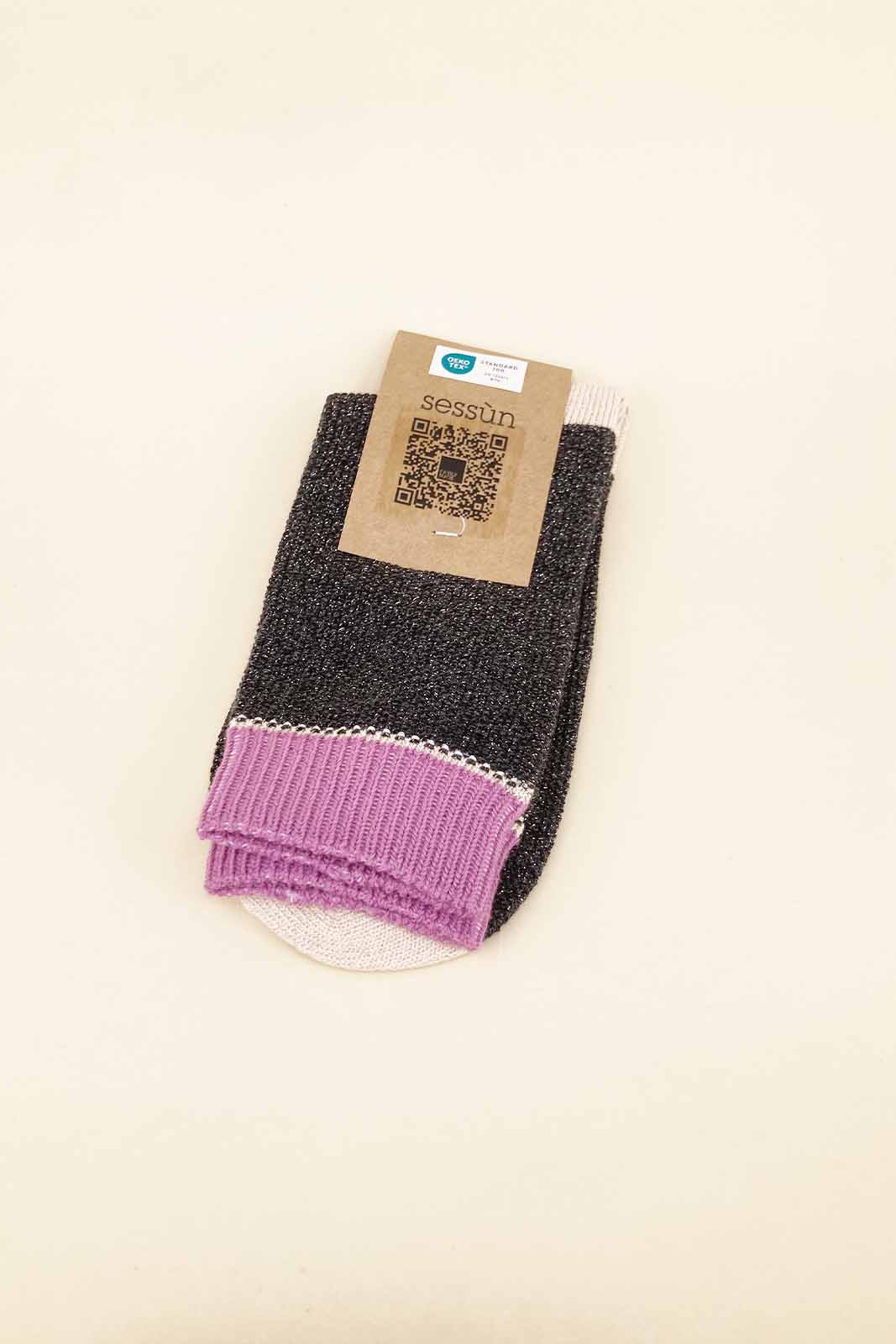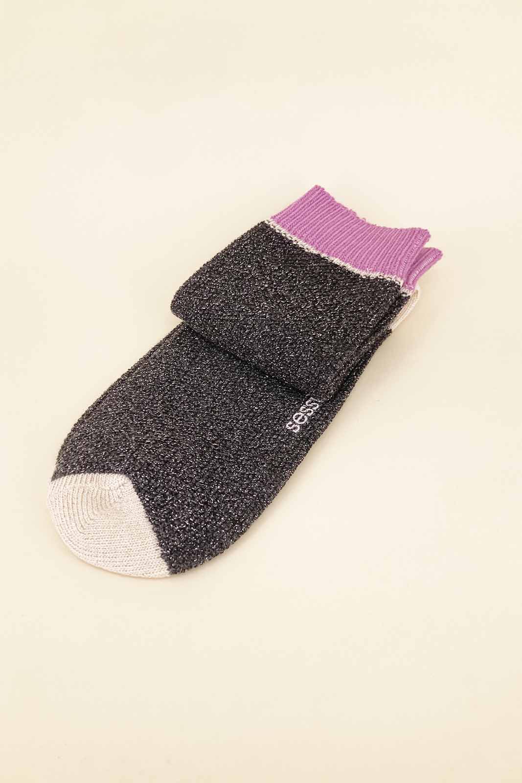 Die Socken Voyageur in der Farbe Black Graffit von Sessun bestehen aus 81% Bauwolle, 12% Polyamide, 5% metallische Fasern und 2% Elasthan.