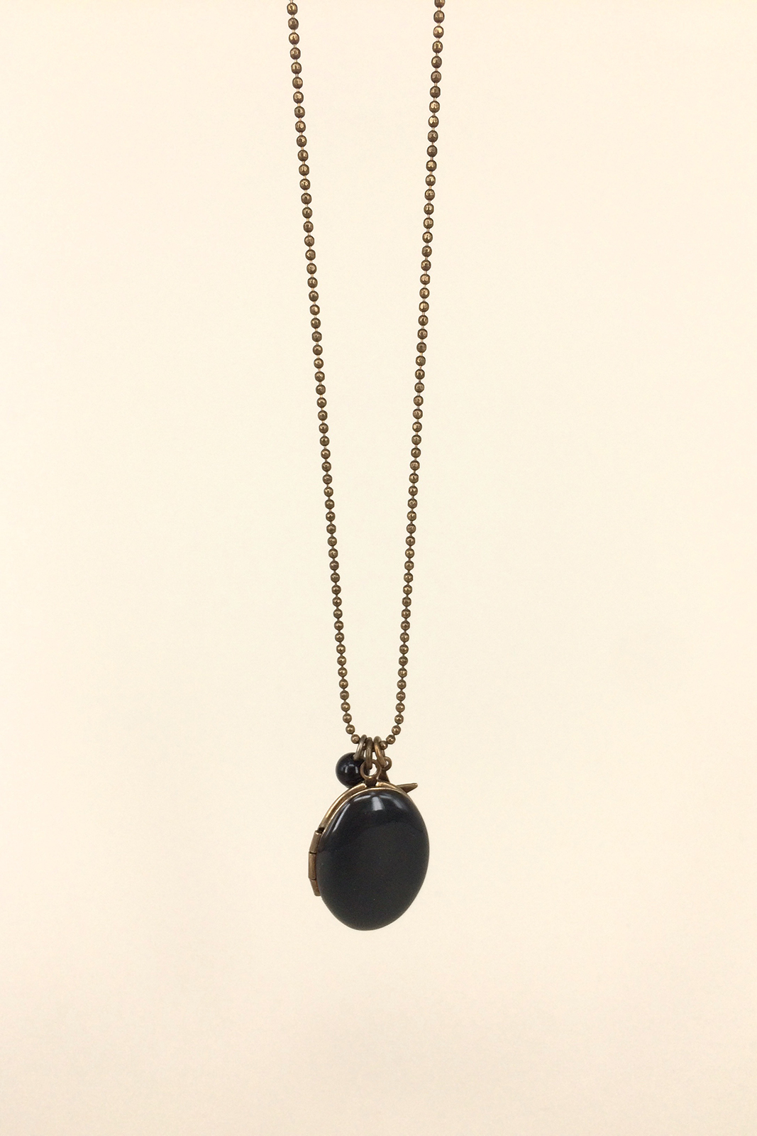 Die lange Kette Boite in der Farbe Noir von Virginie Monroe besteht aus Messing und hat ein aufklappbare emaillierte Anhänger. Die Länge beträgt ca. 40 cm
