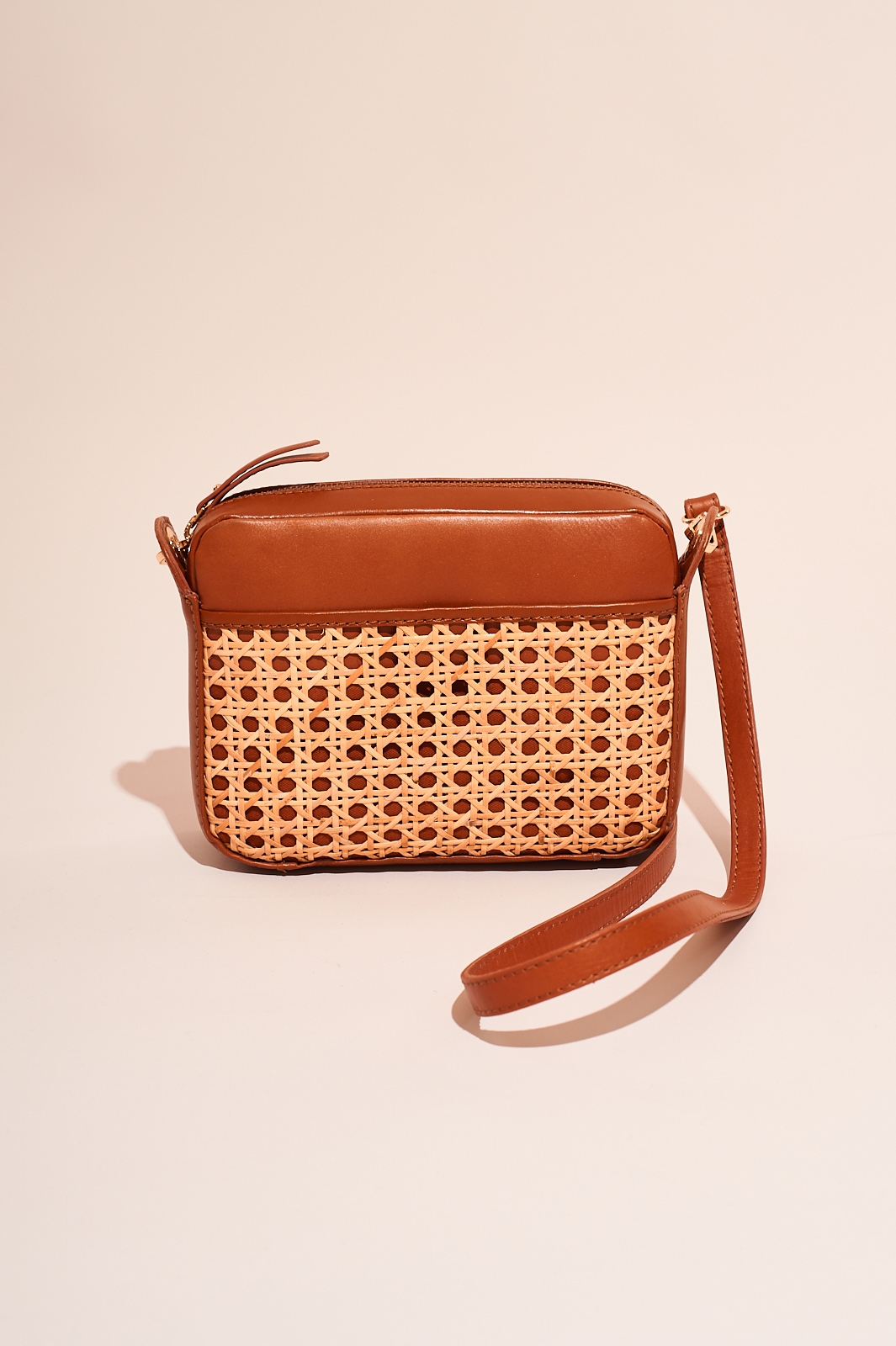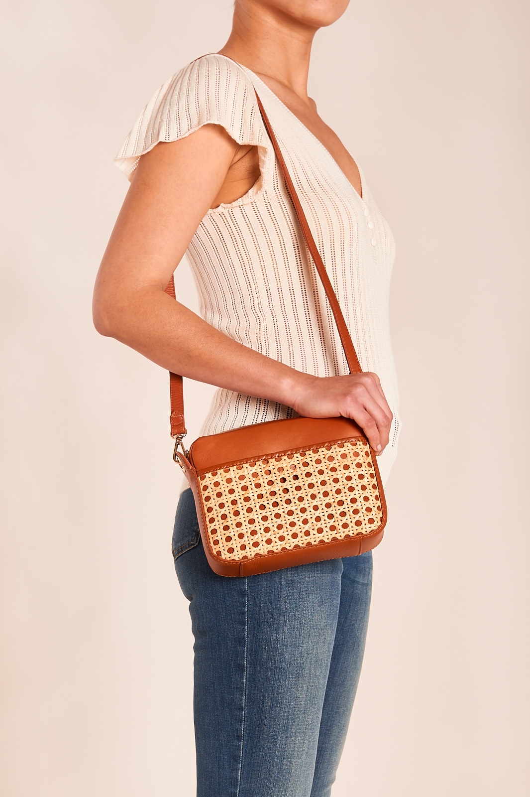 Die geflochtene Tasche Eris in der Farbe Natural von Petite Mendigote besteht aus 50% Leder und 50% pflanzlichen Rohstoff. Die Masse beträgt 21 x 6 x 15 cm